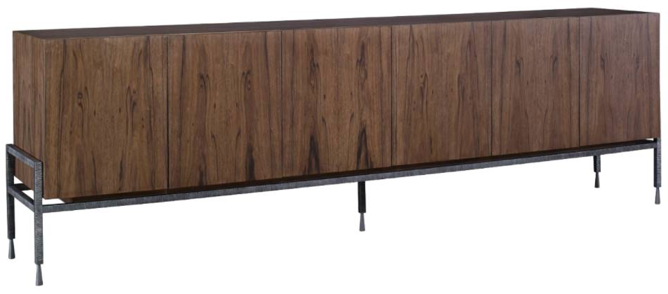 The 110” Gaston is wrapped in beautiful figured paldao veneer and sits on top of an architectural iron base. The clear dry finish really lets the exotic figured paldao shine through. This six door cabinet makes a statement in a entryway, dining room or family room.Read More