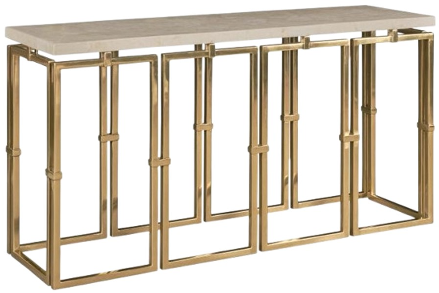 This beautiful statement console table was inspired by classic jewelry links. Open cast brass fretwork base with a floating top made of crystal stone quartz in warm ivory tones. Also available as a large cocktail, smaller cocktail, side table, martini table and desk.Read More