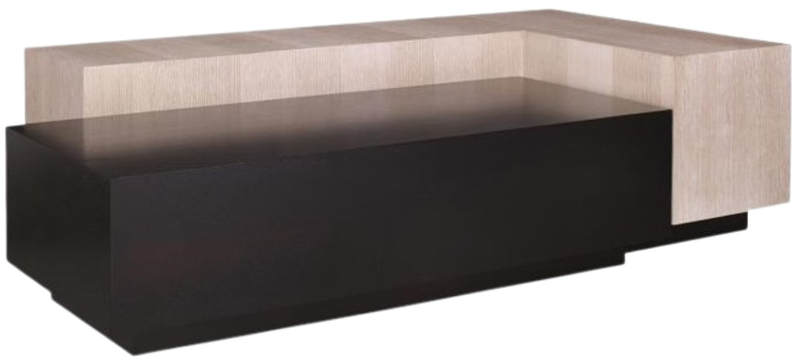 A modern large scaled statement cocktail featuring a high low effect for drama. Oak and Walnut Veneers provides a natural color and character variation. The taller "L" shaped area features a Light cerused finish on wire brushed oak and the lower shelf features Dark Coffee on walnut.Read More