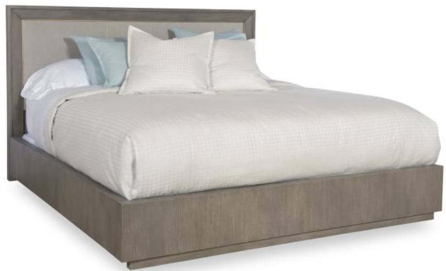 Our Kendall series reflects today’s casual contemporary lifestyle. Its understated, clean line forms, linear oak grain, and soft gray finish offer a calming and welcoming vibe. The bed features an upholstered headboard in taupe velvet surrounded by a satin gold finished metal trim.Read More