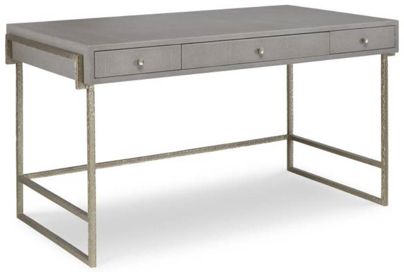 The Laurent is a transitional collection of leather-wrapped forms embossed with a soft shagreen pattern finished in light Champagne coloration. The solid metal bases feature an artisanal texture that compliments the soft pebble grain of the shagreen. Three drawers feature soft-close mechanisms and offer ample storage for writing accessories.Read More