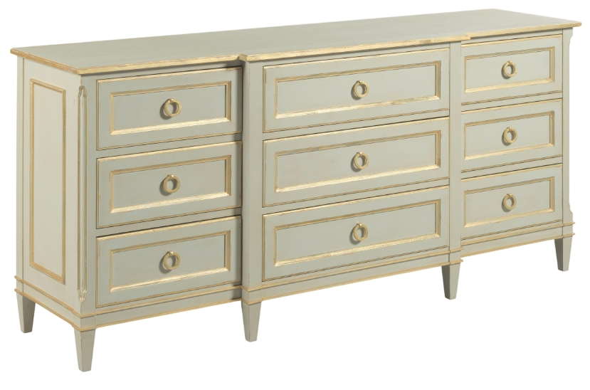 The Madeline dresser features a beautiful antiqued Swedish worn grey finish with gold leaf highlights. With nine working drawers that feature soft close drawer mechanisms, this dresser offers ample storage and ensures that everything will have its place.Read More