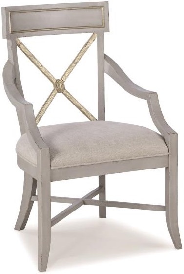 Add function while adding style with the Monarch Madeline Arm Chair. A beautiful dining chair that can work well in any style of the dining room. Finished in a distressed Swedish worn grey paint the "X" back is adorned with gold leaf highlights while the seat is upholstered in a textured linen fabric.Read More