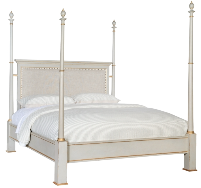 This dramatic Regency-styled poster bed is constructed of poplar solids and finished in a distressed Swedish worn light grey finish with hand applied antique linen accents and a textured linen fabric panel trimmed with tape and spaced nails. The footboard posts are removable for a platform bed option.Read More