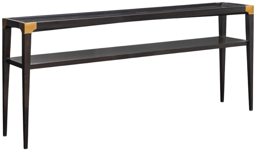 The scale of the Addison console table is a perfect height for behind most sofas and has a significant scale to provide a nice surface area and a mid-shelf for favorite books on tap for the winter. Acacia in a rich mocha finish with aged brass corner brackets.Read More