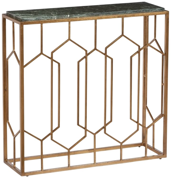 This open deco style console provides a very interesting blend of materials and a nice smaller footprint. The iron is beautifully finished in a gold leaf contrasting with the unique polished tikal green marble top.Read More