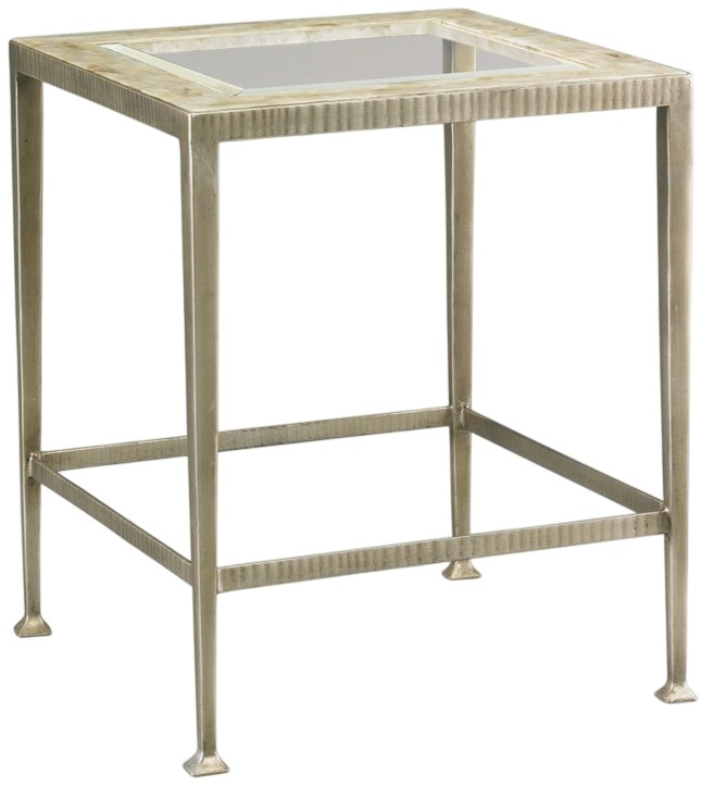 Cadiz collection square side table featuring artisan crafted forged iron with ribbed detail surrounding the top and stretcher and a stylish inset top of Capiz shell with with clear beveled glass.Read More