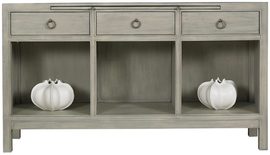 Nicely scaled console with large storage areas as well as three drawers and a functional pull-out tray. The wood is acacia that has been finished in what we call gray breeze for its pleasant light airy feel. The console was designed as an entertainment unit.Read More
