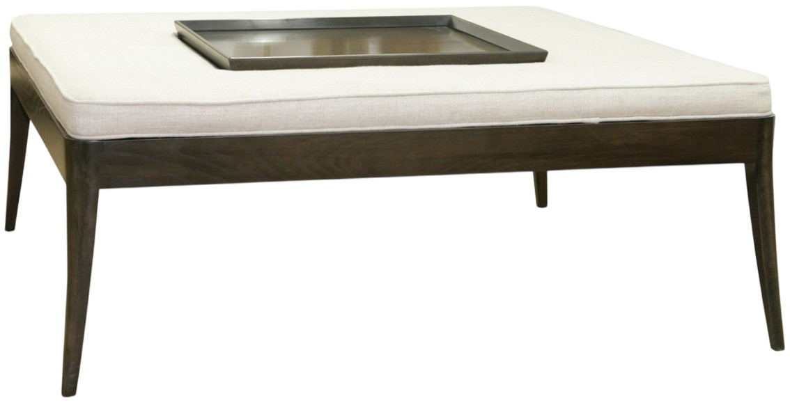 Large scale square upholstered top ottoman with double-needle stitching. The top has an inset finished removable wood tray. The framing and legs are a combination of maple solids and veneers, and the top can be custom upholstered in fabric or leather.Read More