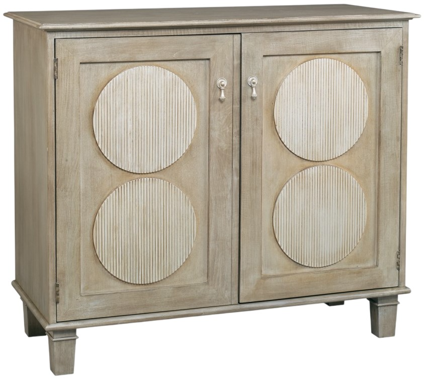Two door chest with one adjustable shelf. The ribbed disc motif applied to the doors creates a great opportunity to customize in a second finish to provides its own personality and tie into your setting.Read More