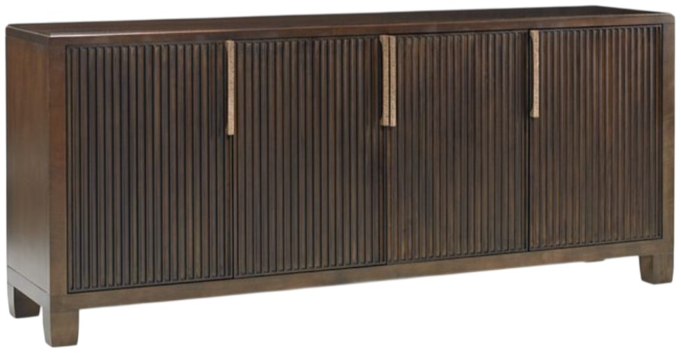 Reeded door credenza offering great scale and lots of storage space. The two center doors house interior drawers with a silver liner as well as an adjustable shelf. The outside left and right doors also have an adjustable shelf within. Textured bar pull hardware is in a champagne gold finish.Read More