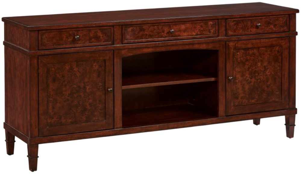 Alder solids and beautiful mappa burl veneers join to make this beautiful and functional media console. The door and drawer surfaces are mappa burl while the top is a four-piece alder slip matched veneer, all in a clear mappa finish and accented with aged nickel hardware.Read More