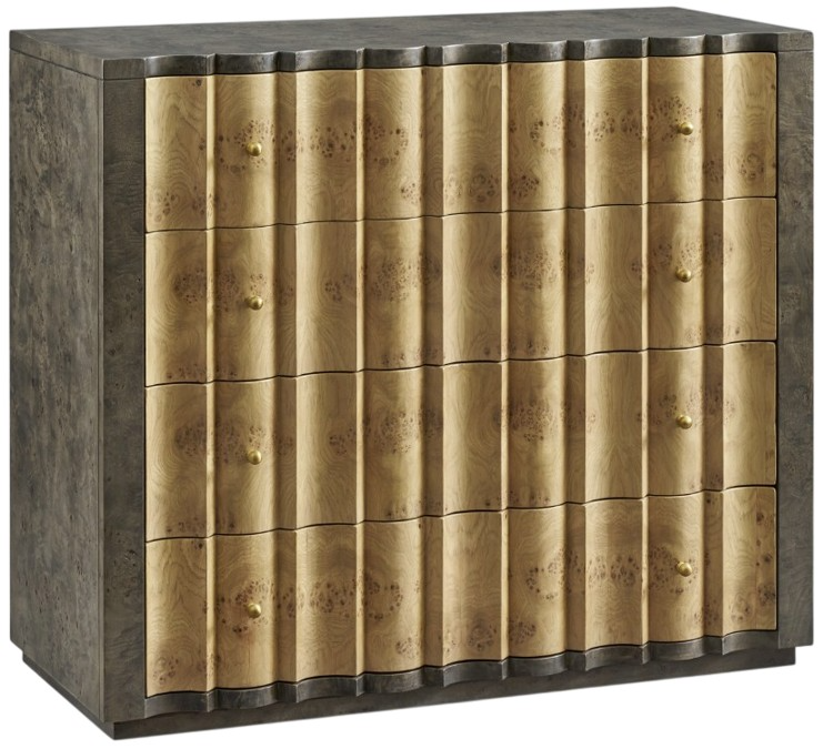 The Ardley drawer chest showcases the beauty of burl wood, making it the centerpiece of any bedroom. Its scalloped shape and contrasting finishes dark grey on the outside and light brown on the drawers create a dynamic visual appeal. Simple brass-finished knobs complement the design elegantly.Read More