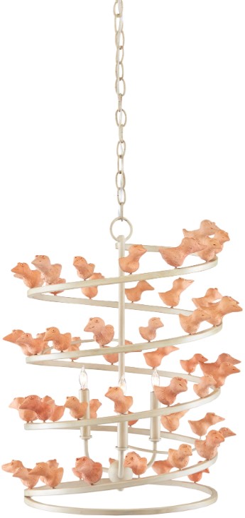The Adarna Chandelier is a playful composition inspired by nature. Handmade terracotta birds of three sizes watch attentively from their spots on the circular frame made of wrought iron in an antique silver leaf finish.Read More