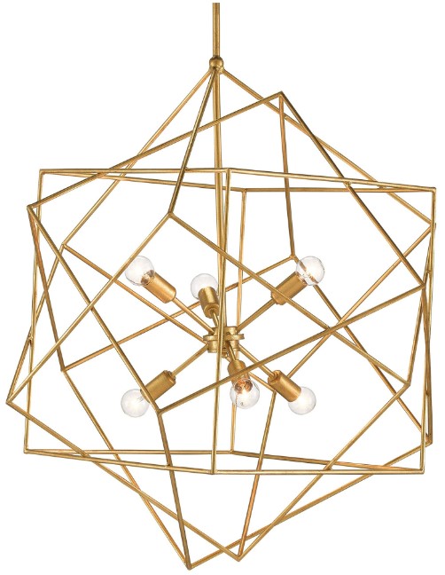 The Aerial Gold Chandelier exhibits an innovative use of materials. The wrought iron frame is woven into a series of angular cubes in a warm antique gold leaf finish, which introduces a slight feeling of age to the six-light fixture.Read More