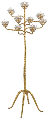 The Agave Americana Floor Candelabra is a grand piece inspired by the Century plant of the American desert. Nine lights are surrounded by clusters of faceted crystals fitted to branches of hand-forged metal tubes in a contemporary gold leaf finish. The gold floor lamp is in our Marjorie Skouras Collection. We also offer the Agave in a number of fixture styles and finishes.Read More