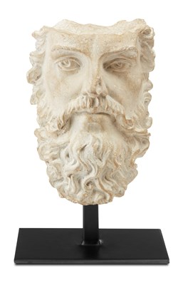 Made of composite in an aged beige finish with random spritzes of antiquing, the Head of Zeus masquerades as an artifact. The marble-like sculpture has two artisans to thank for its feeling of authenticity: the mold maker, who is central to the work; and the painter, who hand-paints the piece to create the illusion that it was unearthed after being carved ions ago. The white sculpture is mounted on a metal base in a black finish.Read More