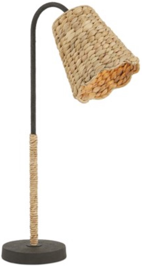 The shade is made of water hyacinth, which brings a textural artistry to the composition. Equally sophisticated is how the thin stem is wrapped in the same natural material. The mole black finish on the woven lamp contrasts the beige tones beautifully.