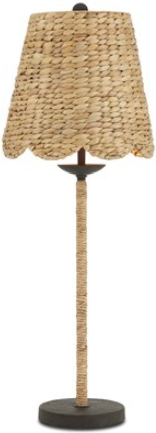 The shade is made of water hyacinth, which brings a textural artistry to the composition. Equally sophisticated is how the thin stem is wrapped in the same natural material. The mole black finish on the woven lamp contrasts the beige tones beautifully.