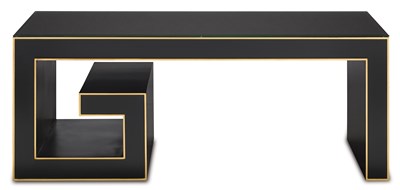 The Artemis Cocktail Table is the latest addition to Barry Goralnick’s Artemis family for Currey & Company. Goralnick continues to play with the scale and application of the Greek Key motif in this graphic, show-stopping piece. The simplicity of a waterfall table is married with a single over-scaled Greek Key, which is asymmetrically set. The result is a fresh, graphic form with a gorgeous hand-applied caviar black finish. The evocative form is highlighted with hand-applied stringing of gold leaf. We also offer the Artemis as an entry/dining table and as a leather chair.Read More