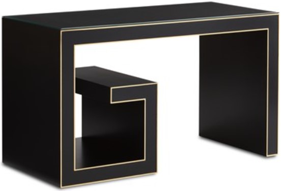 The result is a fresh, graphic form with a gorgeous hand-applied caviar black finish. The evocative form is highlighted with hand-applied stringing of gold leaf. This desk includes a glass top.