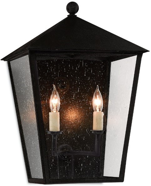 The metal on this black sconce in a midnight finish surrounds seeded-glass panes. We also offer this design in large and small sconces, and as hanging lanterns and post lights.
