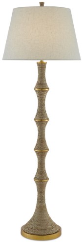 An intermingling of materials brings the Bourgeon Floor Lamp its sophistication. Wrapped in Abaca rope, the matte sections along the stem are divided by metal circlets in a dark contemporary gold leaf finish that gleam when light strikes them. We've topped this tan floor lamp with a beige poplin cotton shade.Read More
