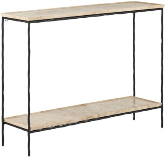 The Boyles Travertine Console Table has a forged iron base in a black finish that holds a tray top made of solid, unpolished travertine. The personality of the surface stems from the fact that it is porous and has a variety of nooks and crannies in its pitting.Read More