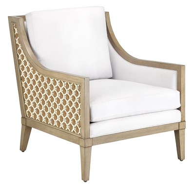 The lovely sides of the Bramford Natural Chair were inspired by a luxurious handbag spotted by our director of furniture Aimee Kurzner. The frame of this chair is made of mahogany with a light wheat finish. The color complements the tan leather inset in the sides. The upholstered surfaces of the tan chair and the cushions are F0214 Finn Natural fabric, which is made of 100 percent polyester. Cleaning code: S. Also available in muslin.Read More