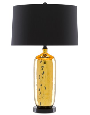 Brilliantly luminous, the Bullion Table Lamp is made of porcelain with a shimmering golden surface splashed with artful droplets. A black optic crystal base anchors the gold lamp that is topped with a black shantung shade with a gold foil lining.Read More