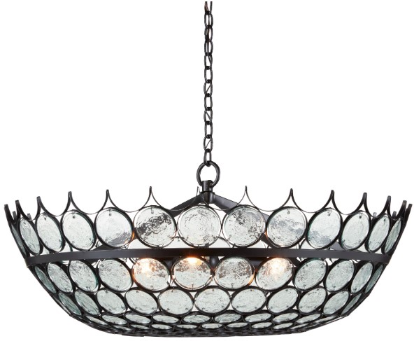 Recycled glass discs are encased in wrought iron in a satin black finish to bring the Augustus Chandelier great aesthetic strength. Design details of note are how unobtrusively the discs are fastened to the frame, the commanding size of the glass chandelier, and the fact that the discs grow smaller as they descend to the bottom of the shade.Read More