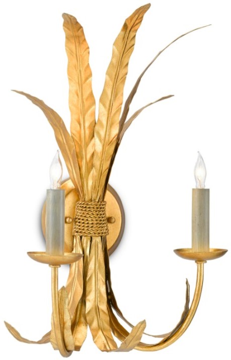 The sheaf of feathers ornamenting the classic shape of the Bette Wall Sconce is a special design note, as is the brilliance of the Grecian gold leaf finish on the wrought iron plumes, arms, bobeches and wall-plate.Read More