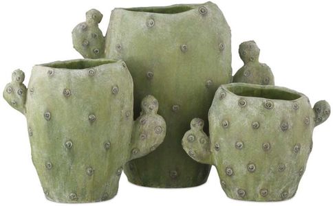 The Cactus Vase Set includes three vases are made of composite to resemble cement. The vases are slathered in varying shades of green for an aged verdigris ombré effect, and the matte glazing, achieved by a dry finish, increases the patina of each of these accessories.Read More