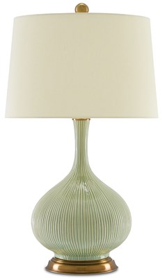The vase-like body of the Cait Table Lamp is made of striated ceramic in a lovely textural grass green. The paleness of this subtle hue is contrasted by the antique brass finish on the base, the hardware, and the orb-like finial. This green lamp is topped with a tan sand linen shade.Read More