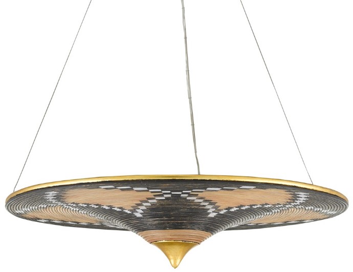The ethnic DNA of the Canaan Chandelier is showing, not only through its shape that has an Asian feel, but also in the patterning on the bottom of the shade, which presents a serious surprise given it is made of rattan. The cap, hardware, and outer rim of the shade on this rattan chandelier are made of wrought iron in a contemporary gold leaf finish. A design detail of note is how the circlets of rattan bring the black and white painted surface added texture.Read More
