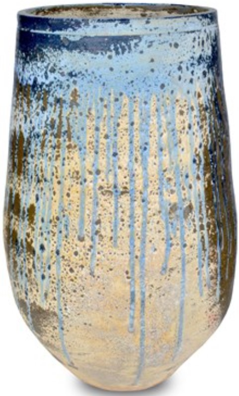 The blue planter has pitting in its terracotta surface to create the feel that it, too, has been tucked away in the landscape for ions.