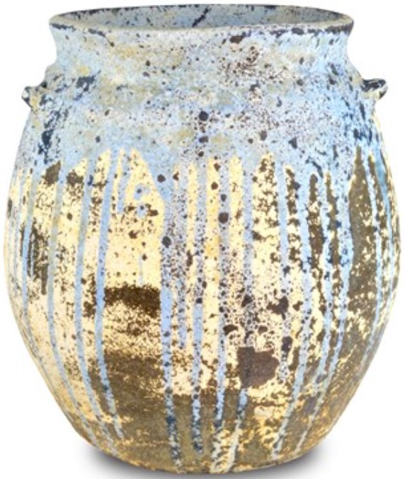 The blue planter has pitting in its terracotta surface to create the feel that it, too, has been tucked away in the landscape for ions.