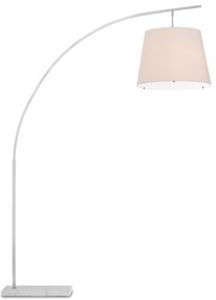 The clean way the stem is fastened to the base and the pared-down lines of the white linen shade enhance the black floor lamp's modernity. The acrylic diffuser fastened by the petite button inial is a clever aspect to this design.
