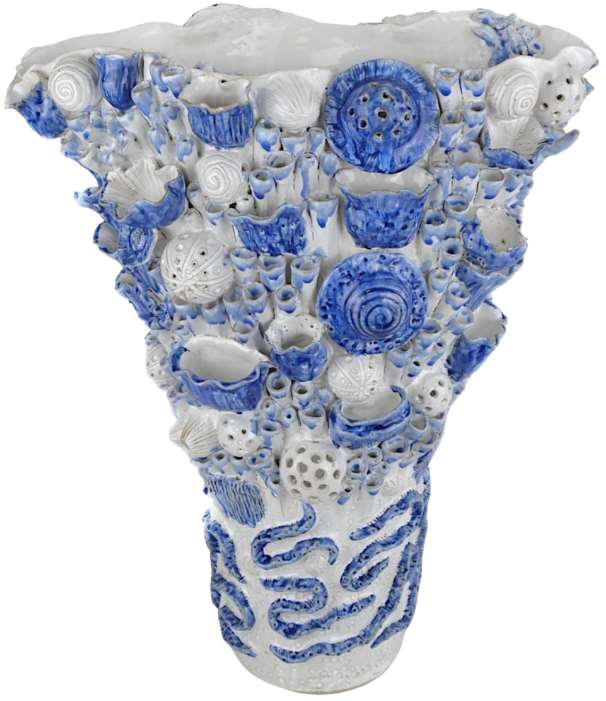 The Coral Reef Large Vase is made of ceramic glazed in a mix of white and reactive blue.