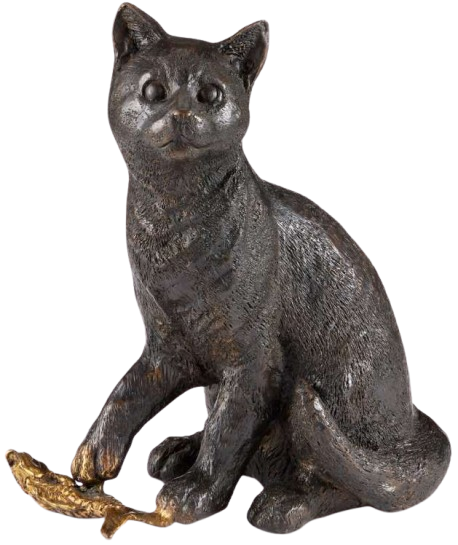 After casting, the artist adds thoughtful touches like polishing or additional finishes to complete the look, illustrated here by the polished goldfish the cat holds in its paws.