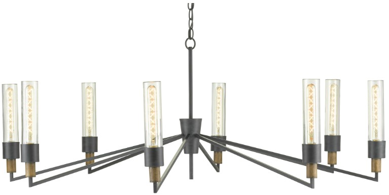 With sharp angles that bring it an industrial feel, the Delgado Chandelier is a perfect fixture for showcasing Edison bulbs, especially tall, lean ones. Made of wrought iron in an antique black finish and wood in a reclaimed wood finish, the black chandelier has clean-lined glass candle sleeves.Read More