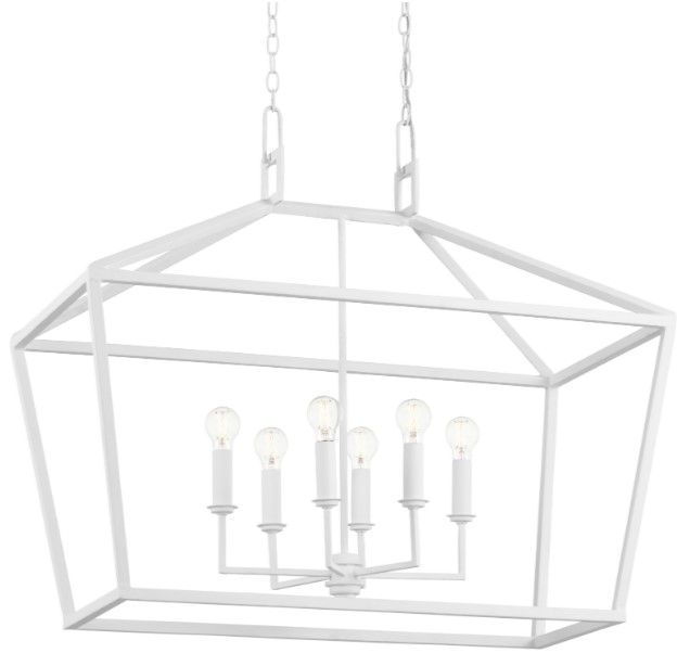 The Denison White Rectangular Chandelier is a hammered wrought-iron fixture in a gesso white finish. This classic lantern shape has stood the test of time to make it one of our most popular offerings. A refined aspect of the design is the square that fastens the lantern to the chain.Read More