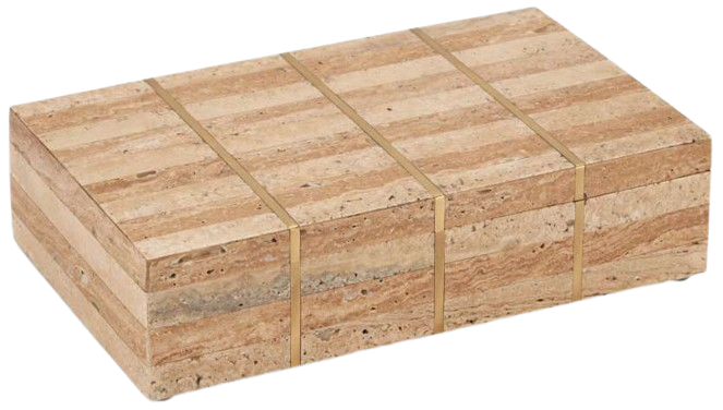 The Dezi Box is made of natural travertine tiles arranged in a stacked dark-and-light pattern with brass inlay running through them. The effect of the intermingling of materials is a pop of brightness as the light hits the metal and a hint of warmth as the stone absorbs it.Read More