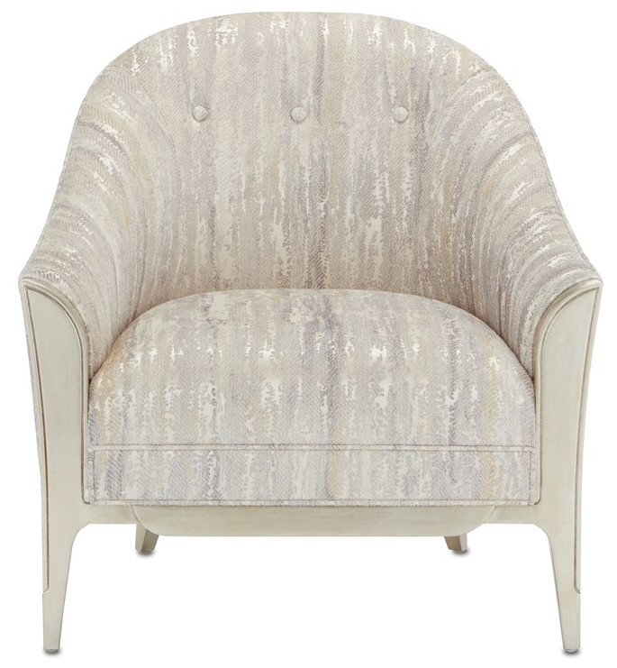 The Emmitt Natural Chair is a small beige chair with a frame in a Harlow Silver Leaf finish covered in a cut chenille fabric in a neutral palette with hints of lavender.