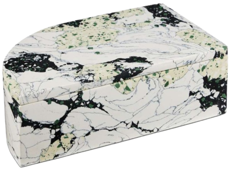 The Fossey Rectangular Box looks like natural granite, but it's actually made of synthetic stone. The black and white decorative box with hints of green and pale yellow has a swirling personality that makes it a textural accent. The one curved edge brings it an interesting profile.Read More