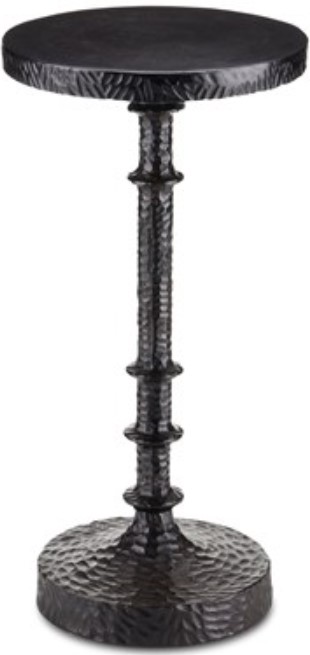 The color of the nearly black occasional table is accented by the bronze finish, which highlights the character in the material with subtle hints of reddish brown. The implied discs that flow along the thin stem from the top to the base further the artisanal feel of its profile.