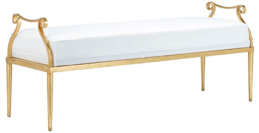 Elevate your living room with this Genevieve Muslin Gold Bench from Currey & Company. Shown in a grecian gold, this bench features a wrought iron base for sturdiness. Make a bold statement by incorporating this stunning furniture to your home.Read More