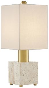The personality of the surface of the travertine stems from the fact that it is porous and has a variety of nooks and crannies in its pitting. Inherent variations in the stone’s texture, veining, and color—from pale ivory to a warm tan—are to be expected and celebrated. Each surface is unique so no two are exactly alike. The shape of the bone linen shade perfectly echoes the scale of this table lamp.