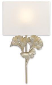 The Gingko Silver Wall Sconce is a botanical-inspired fixture with a distressed silver leaf finish on its wrought iron frame. The leaves that fan out from a central stem are in perfect scale to the off-white shantung shade. The fixture meets ADA requirements. We also offer the sconce in a Chinois antique gold leaf finish.Read More