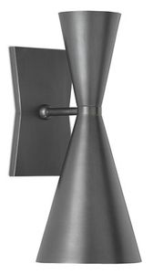 The Gino Wall Sconce is a mid-century modern sconce with two bulbs, one for up-light and one for down-light. The exterior of the spun-metal shades and wall plate in a dark gray finish contrast the interior of the shades that are painted white. The black sconce is one of several Gino products we offer.Read More